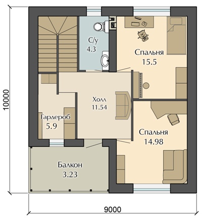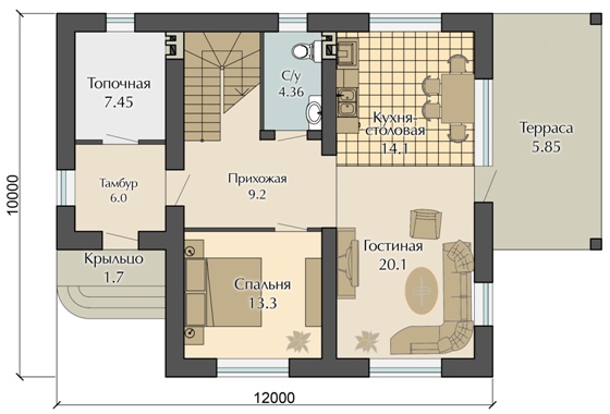 Уютная спальная комната и большая гостиная являются достоинствами данного проекта дома. Эти помещения, благодаря стильной дизайнерской отделке, смогут доставить максимум удобства как владельцам загородной недвижимости, так и гостям, которые придут их навестить. А большая терраса делает проект ещё более привлекательным.