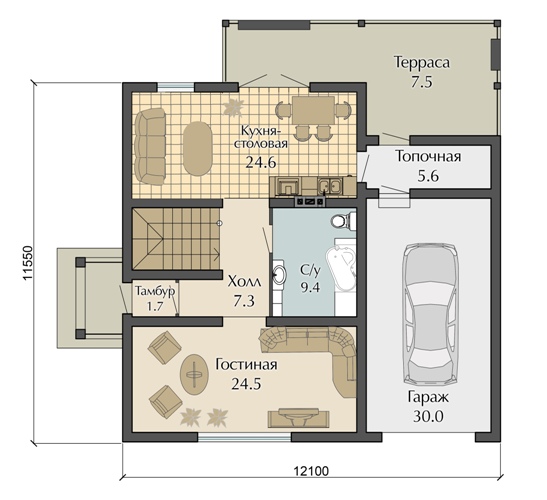 Большая по размерам терраса понравится людям более старшего поколения, ведь на ней можно отдыхать, наслаждаясь свежим воздухом и встречая гостей. Кухня-столовая, размещённая возле террасы, является одним из преимуществ данного проекта. А наличие санузлов на обоих этажах обеспечивает двойное удобство для жильцов дома.