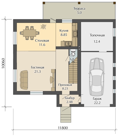 Кроме кухни проект предусматривает наличие столовой, а также большой по габаритам гостиной комнаты. Это делает его более привлекательным с точки зрения эффективного распределения площади здания. Наличие хозяйственного помещения и гаража является ещё одним достоинством проекта.