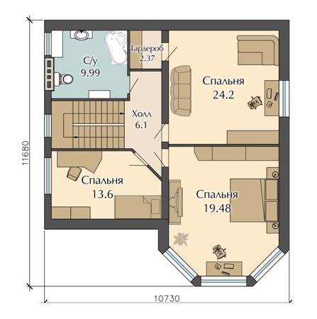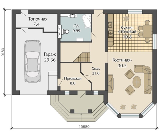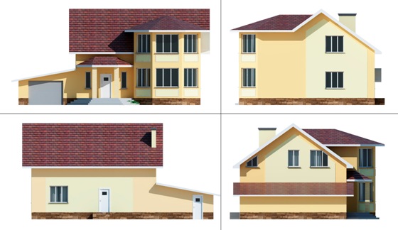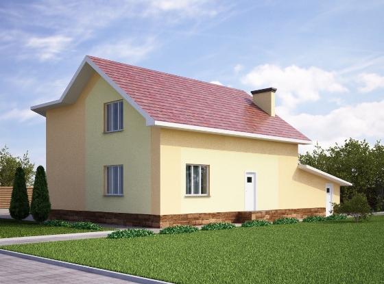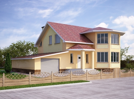 Уютную атмосферу этому домовому проекту придаёт наличие нескольких спален на втором этаже здания, а также большой гостиной комнаты, которая на первом этаже находится. Проектом предусмотрено наличие гаража и хозяйственного помещения возле дома, что является невероятно удобным.