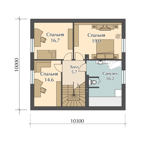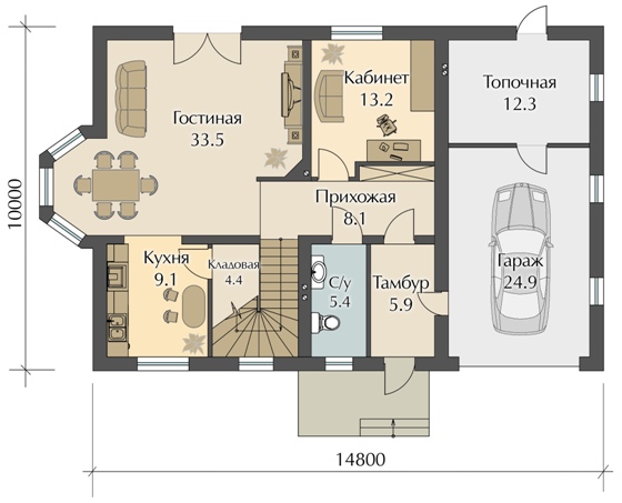 Три большие по габаритам спальни, расположенные на втором этаже здания, дают возможность располагаться большому числу народа в уютной обстановке. На первом этаже находится рабочий кабинет, в котором можно в тишине и спокойствии заняться любимым делом и поработать. Возле кухни находится кладовая, что тоже очень удобно.