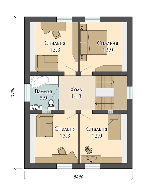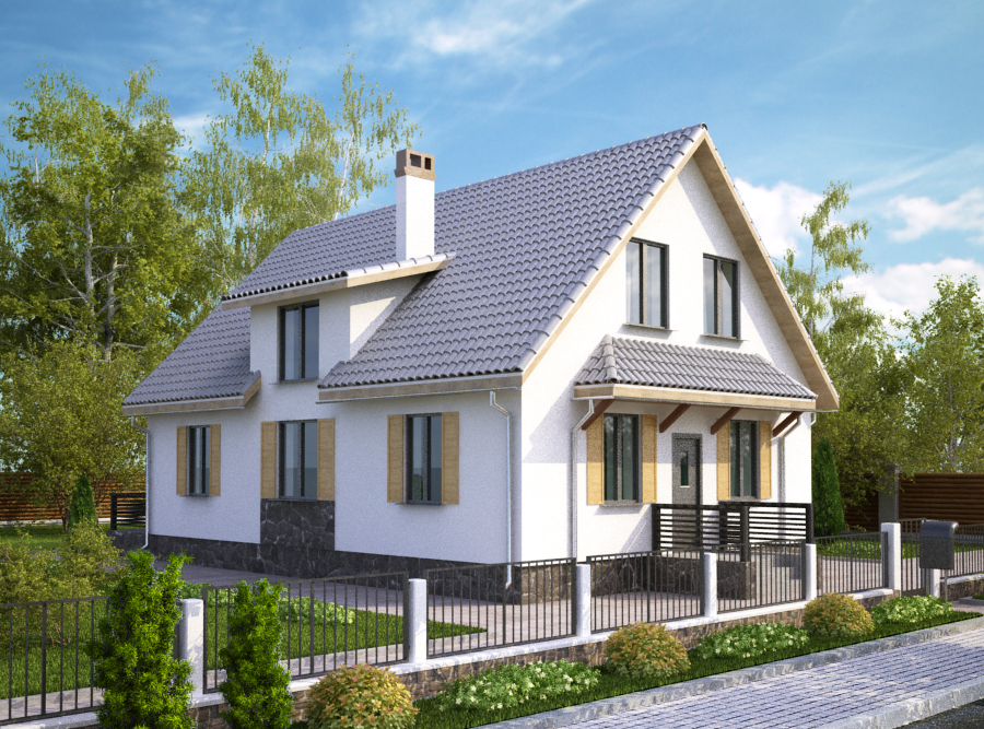 Второй этаж предполагает размещение сразу нескольких спален, в которых можно разместить родственников, приехавших отдохнуть и навестить владельцев дома. Первый этаж является более функциональным, столовая и кухня разделены между собой, создавая дополнительный комфорт.