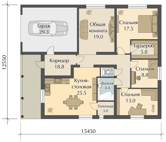 Наличие гаража позволяет быть уверенным в том, что машина не попадёт под дождь и будет находится в хорошем состоянии, в то время как хозяева будут отдыхать от повседневных дел и хлопот. Общая площадь здания достаточно большая, сам проект смотрится солидно и привлекательно.