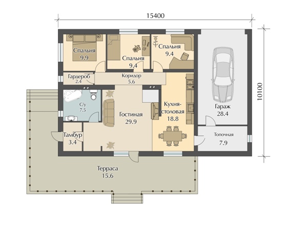 Наличие большой гостиной комнаты делает архитектурный проект более привлекательным для жильцов. В гостиной можно расположить с комфортом как друзей семьи, так и родственников. Благодаря удобному расположению гаража, шум от машины не будет мешать владельцам дома отдыхать.